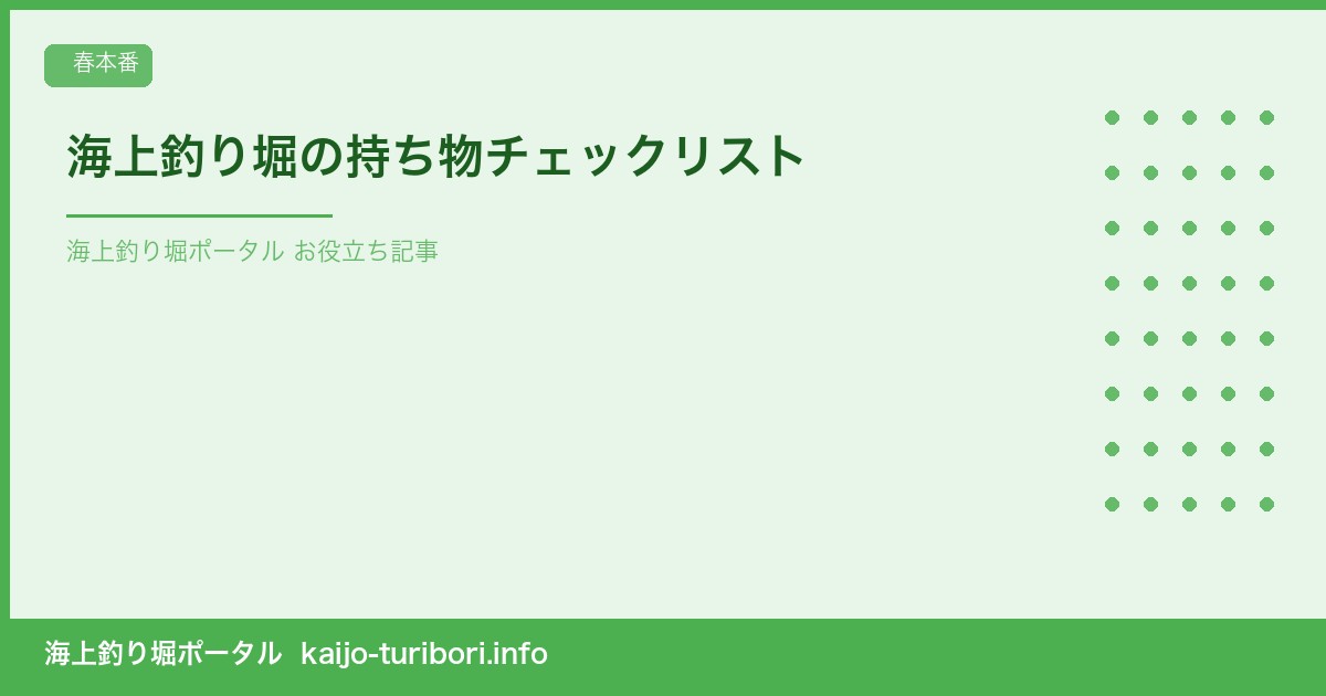 お役立ち記事「海上釣り堀の持ち物チェックリスト」を公開しました。 2026.04.04 2026.04.05 記事のタイトルとURLをコピーする いつも海上釣り堀ポータルをご利用いただきありがとうございます。 新しいお役立ち記事「海上釣り堀の持ち物チェックリスト」を公開しました。 2026.04.042026.04.05海上釣り堀の持ち物チェックリスト海上釣り堀に行くとき、「何を持っていけばいいの?」と悩む方は多いのではないでしょうか。必要なものを忘れると、せっかくの釣りが台無しになることも。この記事では、海上釣り堀に持っていくべきアイテムを「必須」「あると便利」「あると快適」の3段階に分けてチ... 海上釣り堀をもっと楽しむための実践的な情報をまとめていますので、ぜひご覧ください。 Post Share Hatena LINE RSS feedly Pin it note お役立ち記事「海上釣り堀のエサ使い分けガイド」を公開しました。 前の記事 新着のお知らせ 2026.04.03 お役立ち記事「海上釣り堀のエサ使い分けガイド」を公開しました。